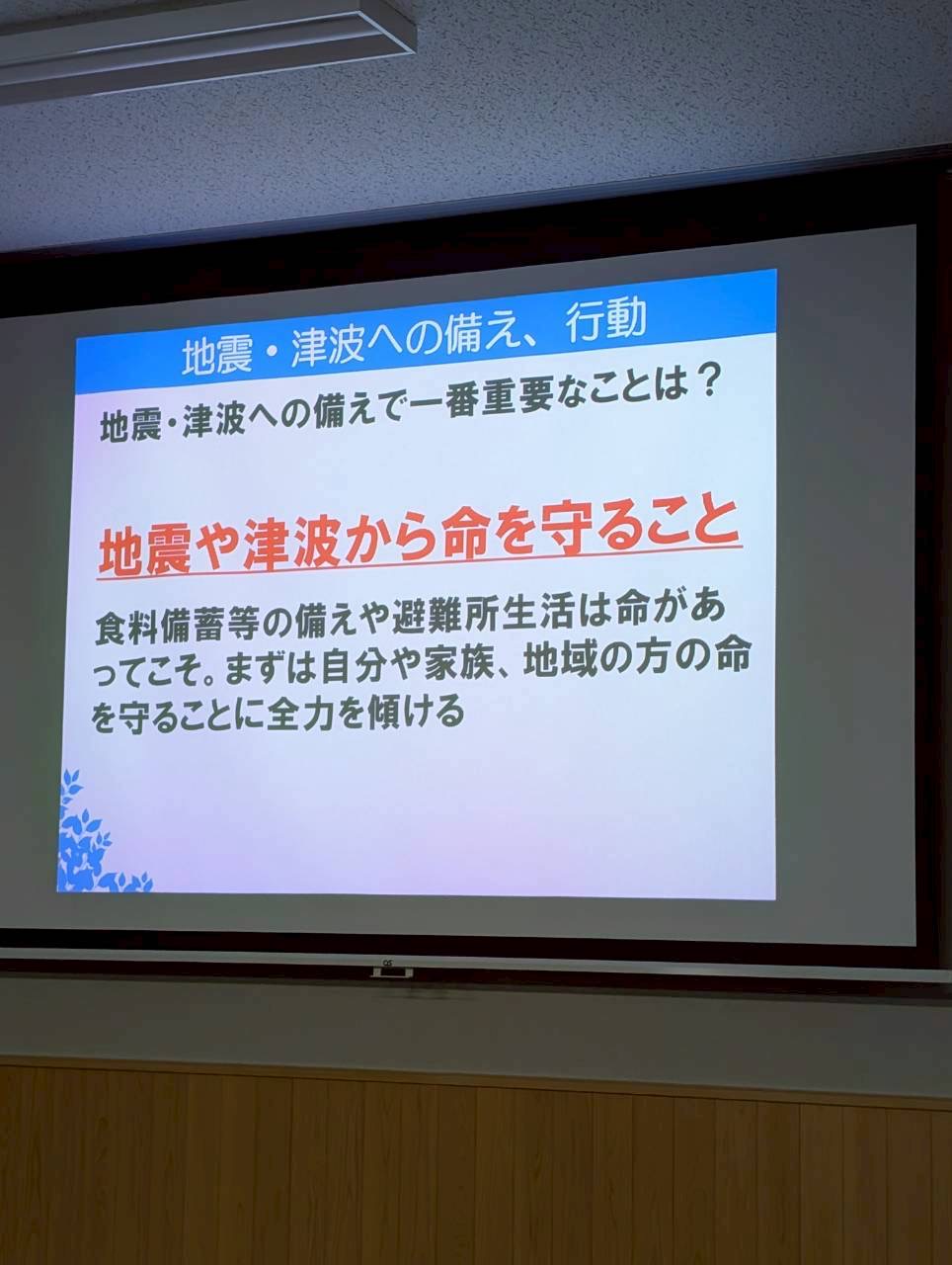 静岡県では、歴史上定期的に大地震が起きている事から約170年もの間地震が起きていない今、危機感を持たなければいけないということ、災害に備えないといけないということ、もし起きた時の話し合いを家族としなければいけないという事を学ばせていただきました。