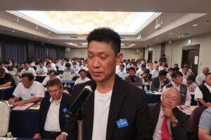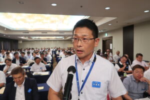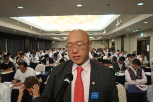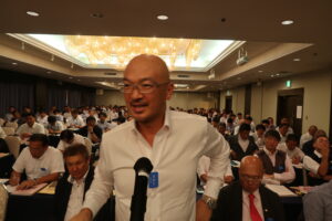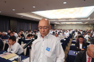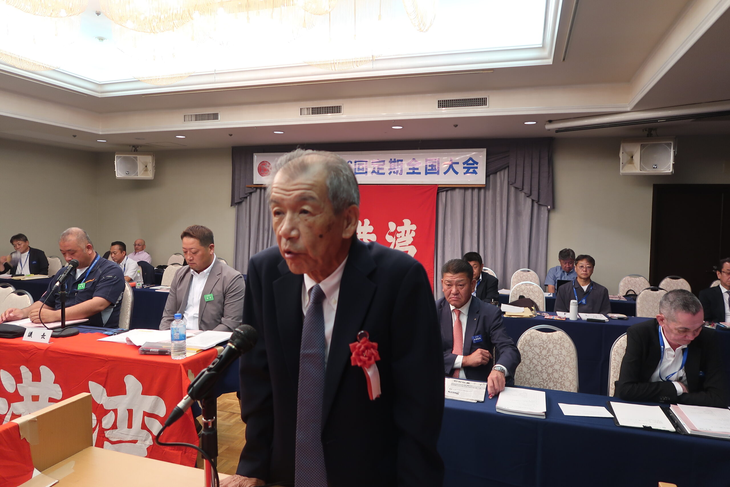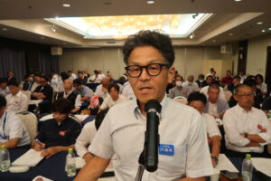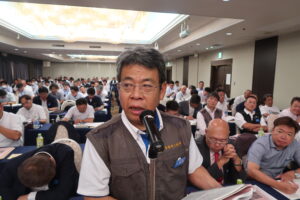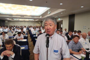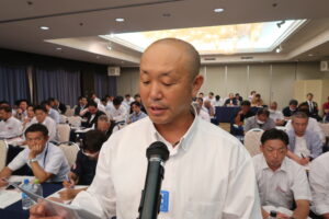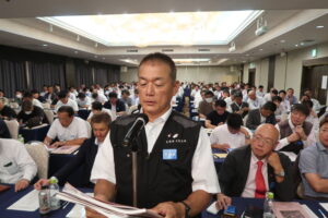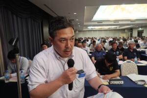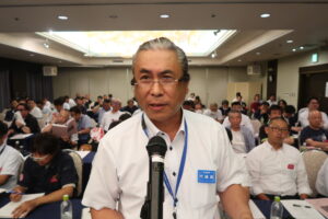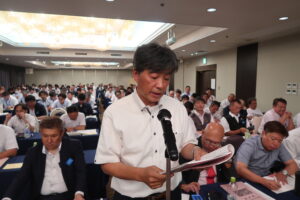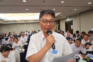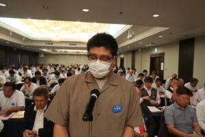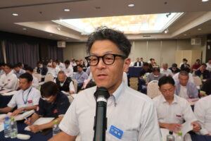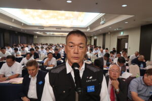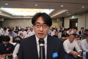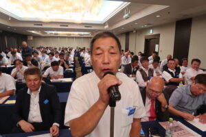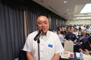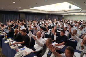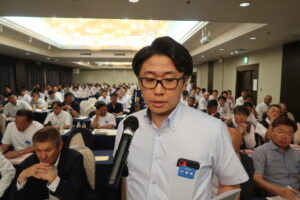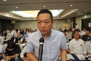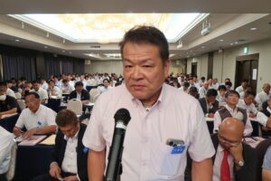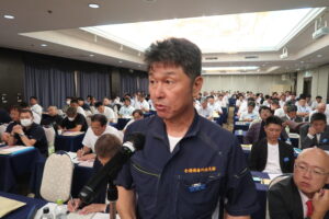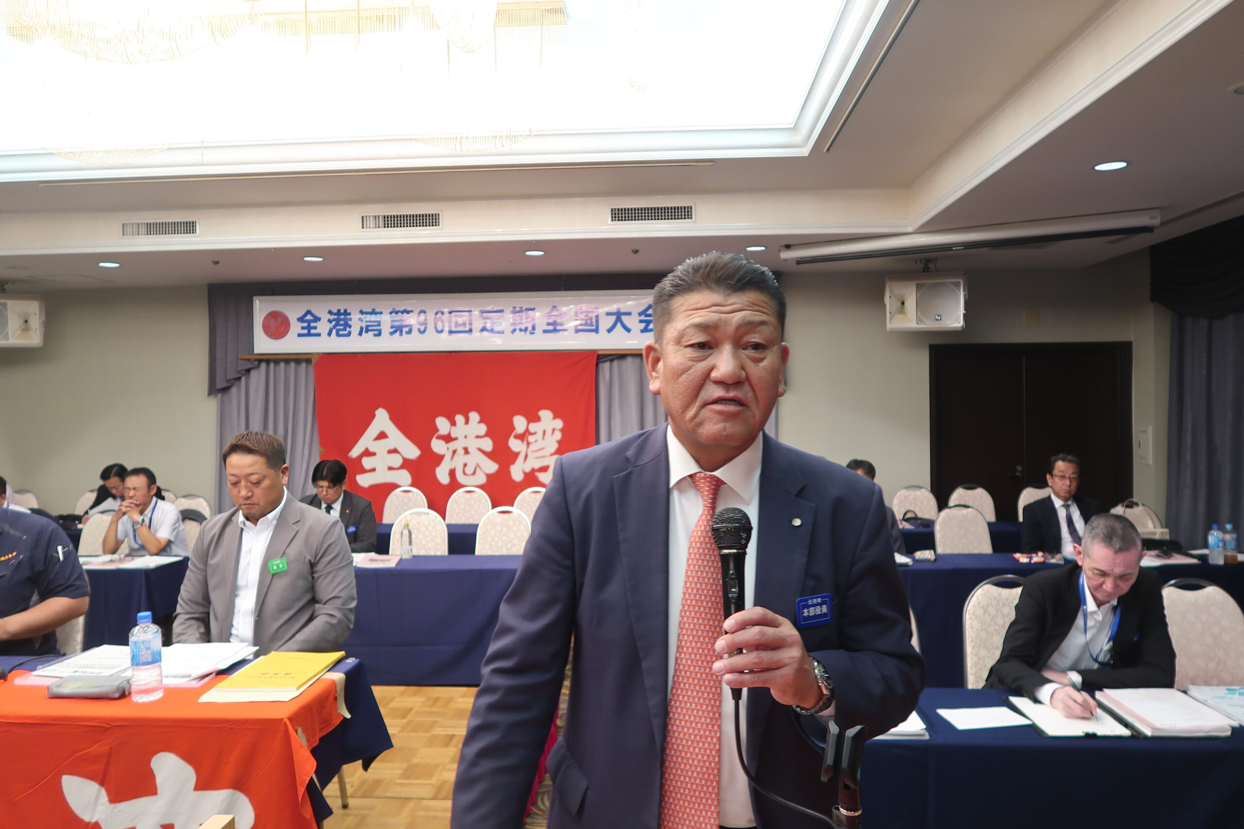 それから討議の中で、松永書記長、丁寧に答弁をしていただきました。執行部としてなんの齟齬もない答弁がされておりますので、松永書記長の答弁がそのものであるということを申し上げておきたいと思います。その上でですね、私、大会の冒頭の挨拶をさせていただいたのは、1つ1つの課題や、平和のと言いますか、先の戦争が終わって80年、その80年後の今が二度と過ちを繰り返さないとやってきた、我々の先輩たち、日本国民の気持ちとちょっと逆行しているようなところがあるという、すごく危機感を持った話をさせていただいたつもりであります。そういうことの議論の中で、やっぱり特定利用港湾等も発言も目立ち、とてもそういうきな臭い方向で、平和にもなりづらいというお話もあったというふうに思っています。そんなところでこの大会で意思確認と言いますか、共有できたというふうに思っております。