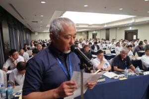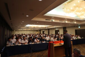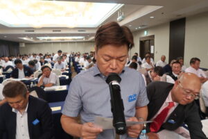 最終日の8月9日には、閉会総会が長崎県立総合体育館アリーナで開催されました。猛烈な降雨のなかでしたが、約870人の参加がありました。まず、米村豊・現地実行委員長から主催者あいさつでは、核使用の危機が高まる世界情勢を踏まえつつ、「核抑止」の虚構性を指摘され、核廃絶に向けともにがんばる決意が表明されました。