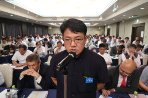 また、「特別報告」として、佐賀県平和運動センターの宮島正明・事務局長より、オスプレイ配備に伴う自衛隊基地強化の問題、そして放射性廃棄物最終処分場選定に向けた玄海町での文献調査の動きについて、それぞれ報告がありました。